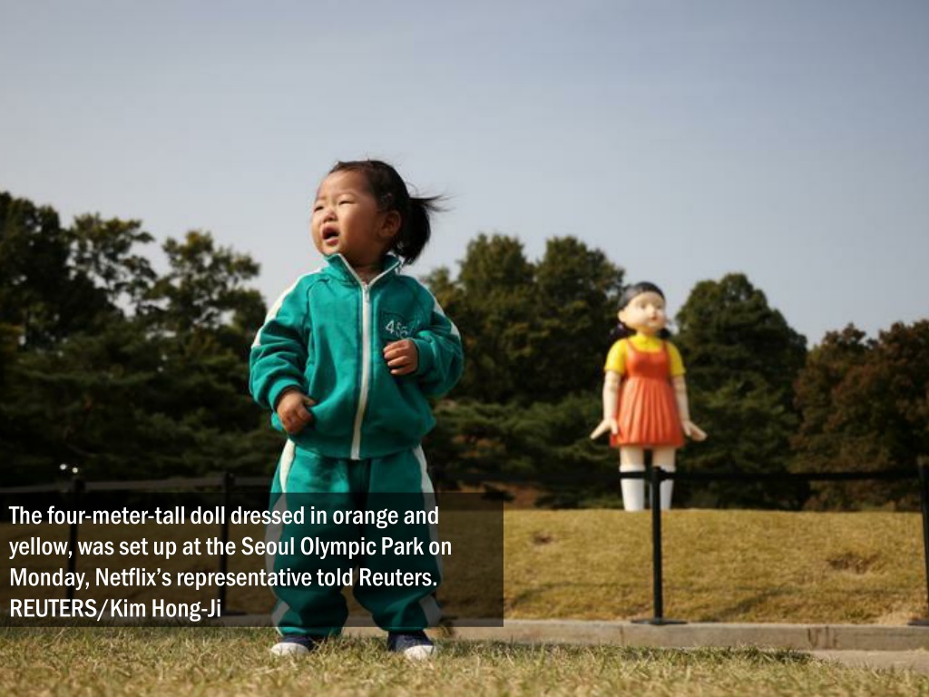 The four-meter-tall doll dressed in orange and yellow, was set up at the Seoul Olympic Park on Monday, Netflix’s representative told Reuters. REUTERS/Kim Hong-Ji
