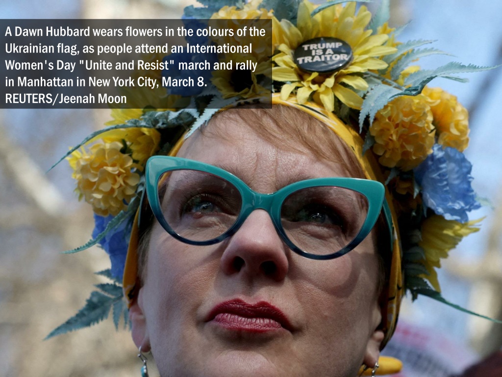A Dawn Hubbard wears flowers in the colours of the Ukrainian flag, as people attend an International Women's Day "Unite and Resist" march and rally in Manhattan in New York City, March 8. REUTERS/Jeenah Moon