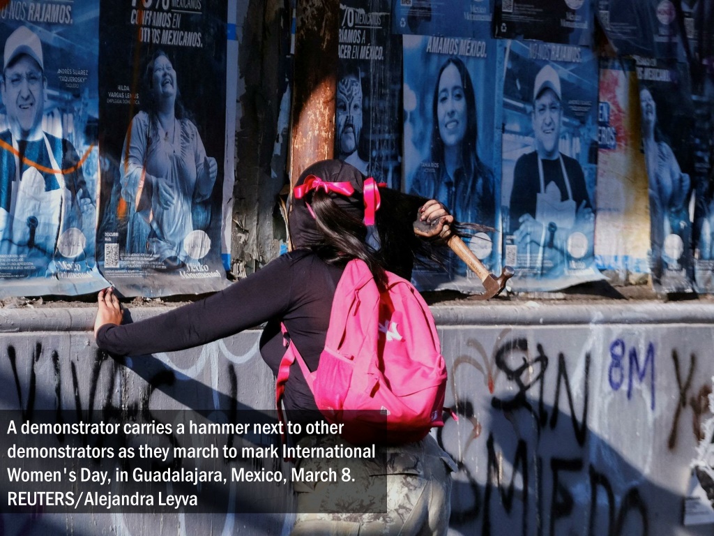 A demonstrator carries a hammer next to other demonstrators as they march to mark International Women's Day, in Guadalajara, Mexico, March 8. REUTERS/Alejandra Leyva