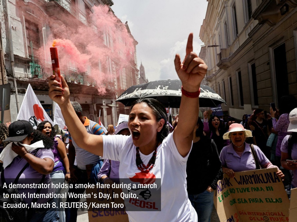 A demonstrator holds a smoke flare during a march to mark International Women's Day, in Quito, Ecuador, March 8. REUTERS/Karen Toro