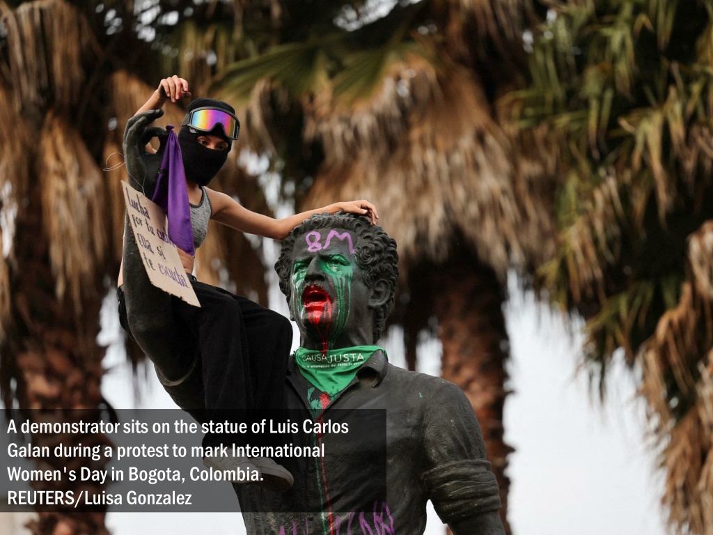 A demonstrator sits on the statue of Luis Carlos Galan during a protest to mark International Women's Day in Bogota, Colombia. REUTERS/Luisa Gonzalez