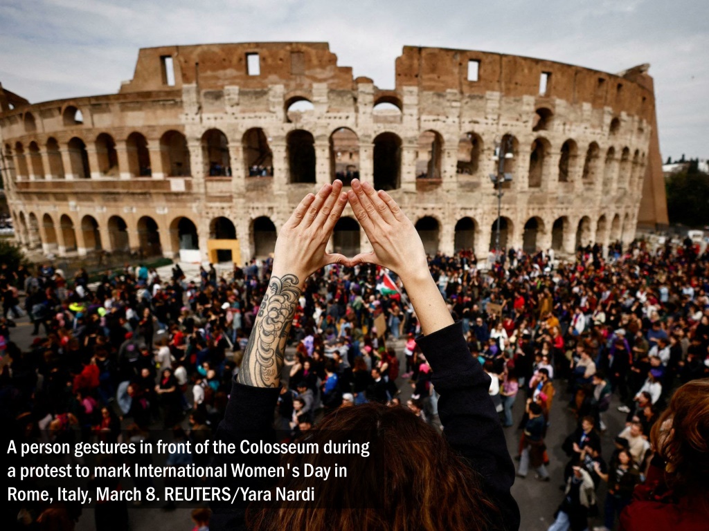A person gestures in front of the Colosseum during a protest to mark International Women's Day in Rome, Italy, March 8. REUTERS/Yara Nardi