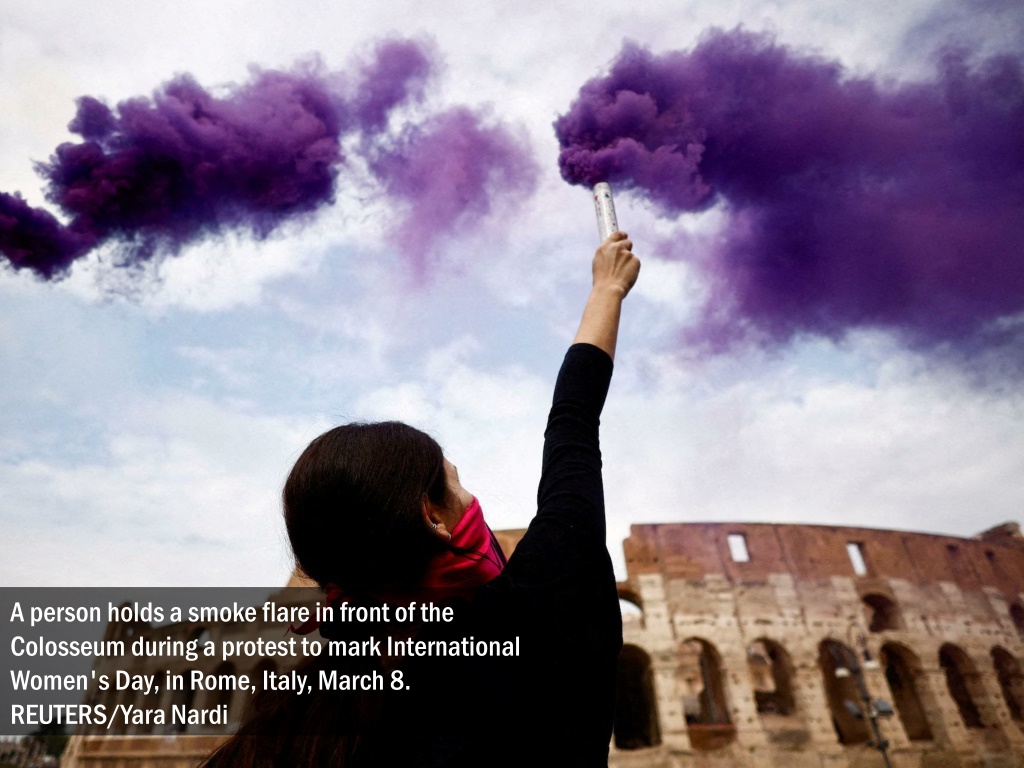 A person holds a smoke flare in front of the Colosseum during a protest to mark International Women's Day, in Rome, Italy, March 8. REUTERS/Yara Nardi