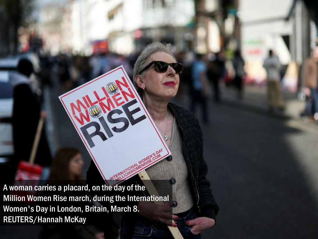 A woman carries a placard, on the day of the Million Women Rise march, during the International Women's Day in London, Britain, March 8. REUTERS/Hannah McKay