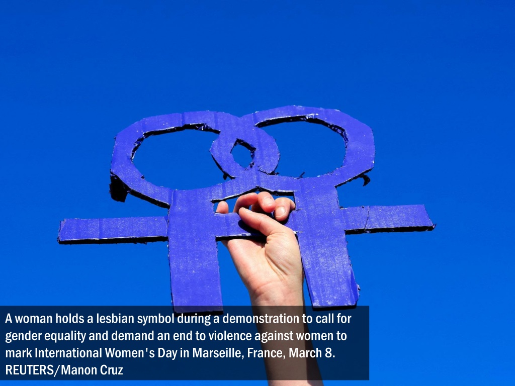 A woman holds a lesbian symbol during a demonstration to call for gender equality and demand an end to violence against women to mark International Women's Day in Marseille, France, March 8. REUTERS/Manon Cruz