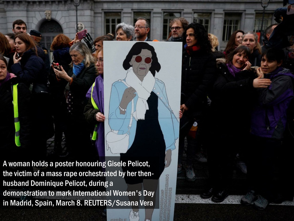 A woman holds a poster honouring Gisele Pelicot, the victim of a mass rape orchestrated by her then-husband Dominique Pelicot, during a demonstration to mark International Women's Day in Madrid, Spain, March 8. REUTERS/Susana Vera