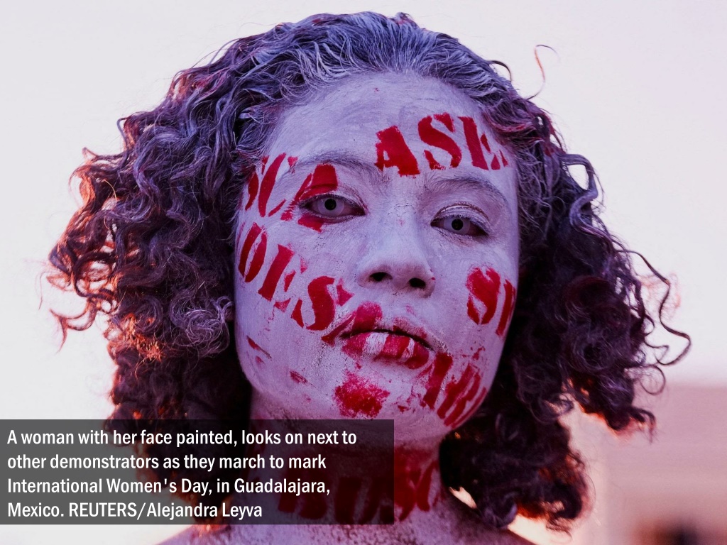 A woman with her face painted, looks on next to other demonstrators as they march to mark International Women's Day, in Guadalajara, Mexico. REUTERS/Alejandra Leyva