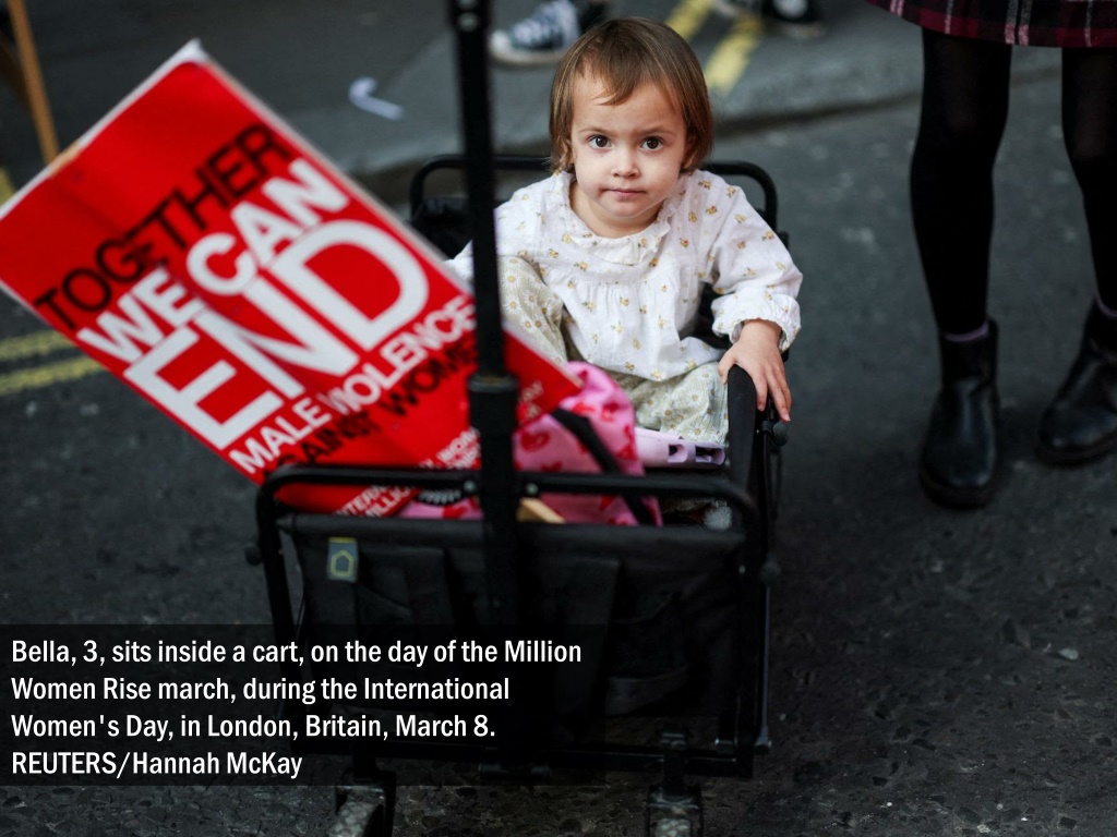 Bella, 3, sits inside a cart, on the day of the Million Women Rise march, during the International Women's Day, in London, Britain, March 8. REUTERS/Hannah McKay