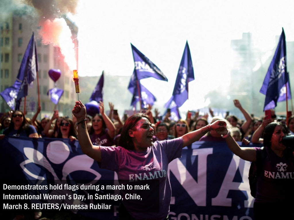 Demonstrators hold flags during a march to mark International Women's Day, in Santiago, Chile, March 8. REUTERS/Vanessa Rubilar