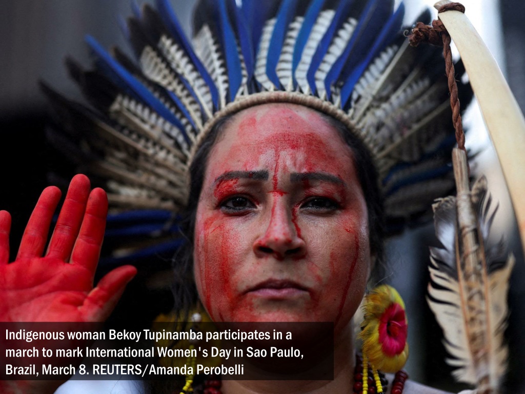 Indigenous woman Bekoy Tupinamba participates in a march to mark International Women's Day in Sao Paulo, Brazil, March 8. REUTERS/Amanda Perobelli