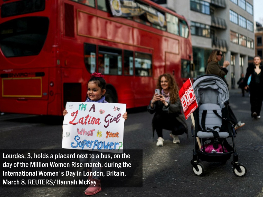 Lourdes, 3, holds a placard next to a bus, on the day of the Million Women Rise march, during the International Women's Day in London, Britain, March 8. REUTERS/Hannah McKay