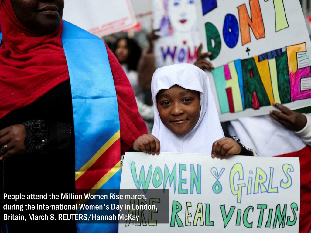 People attend the Million Women Rise march, during the International Women's Day in London, Britain, March 8. REUTERS/Hannah McKay