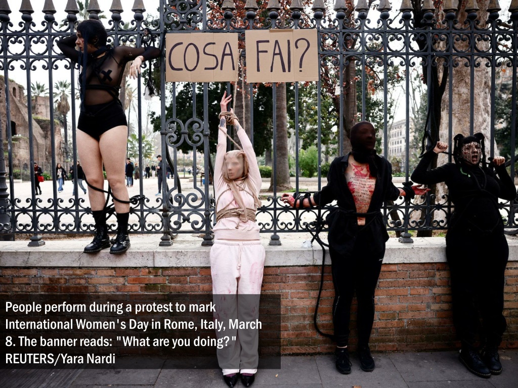 People perform during a protest to mark International Women's Day in Rome, Italy, March 8. The banner reads: "What are you doing?" REUTERS/Yara Nardi