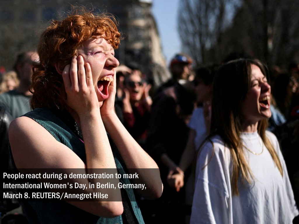 People react during a demonstration to mark International Women's Day, in Berlin, Germany, March 8. REUTERS/Annegret Hilse