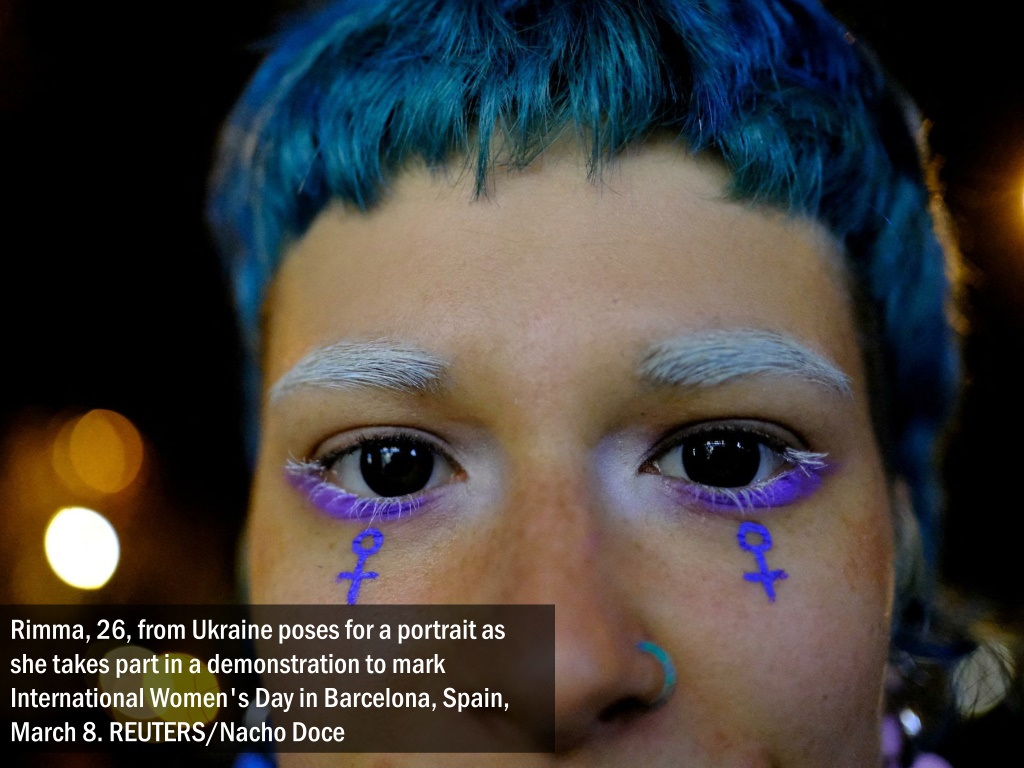 Rimma, 26, from Ukraine poses for a portrait as she takes part in a demonstration to mark International Women's Day in Barcelona, Spain, March 8. REUTERS/Nacho Doce