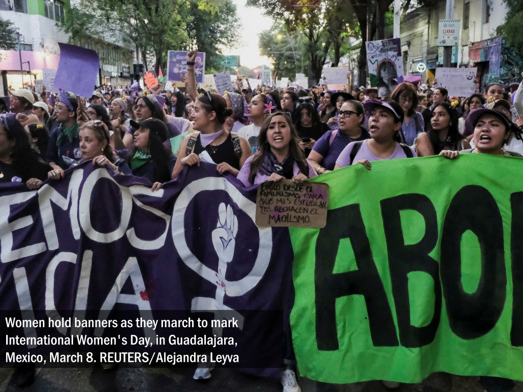 Women hold banners as they march to mark International Women's Day, in Guadalajara, Mexico, March 8. REUTERS/Alejandra Leyva