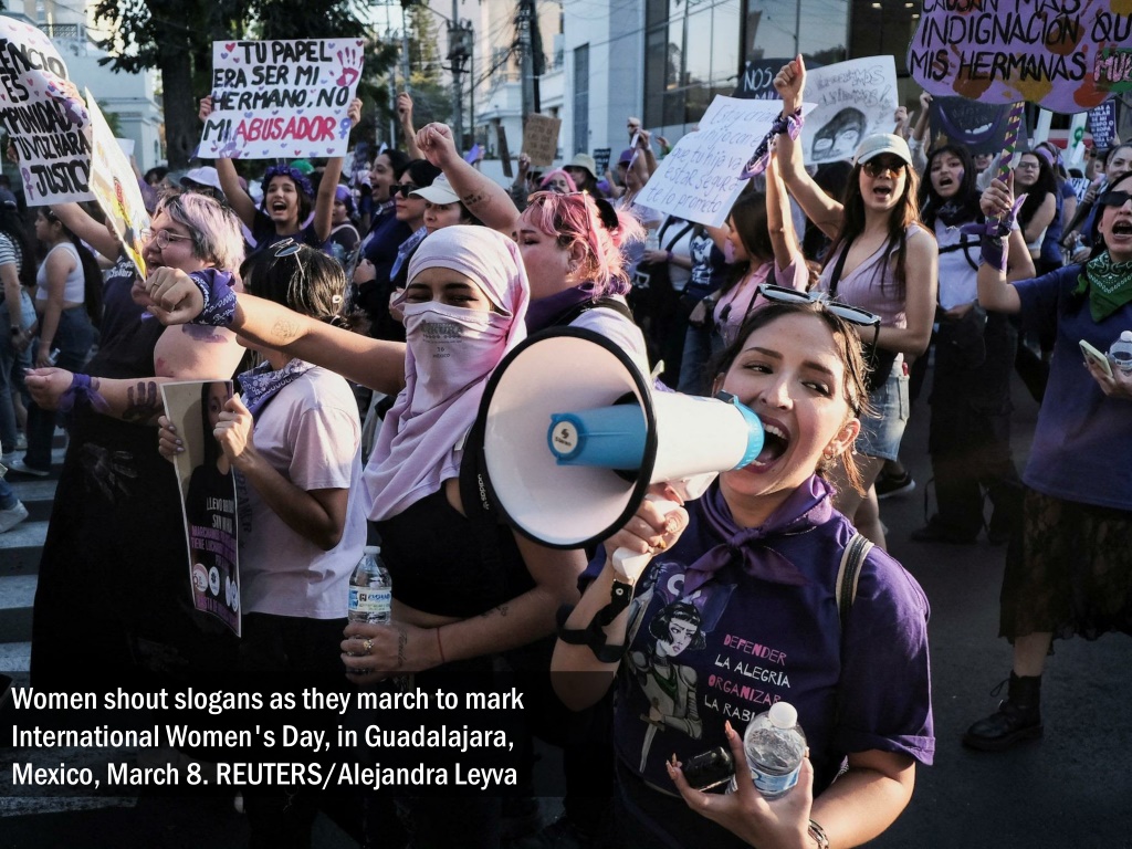 Women shout slogans as they march to mark International Women's Day, in Guadalajara, Mexico, March 8. REUTERS/Alejandra Leyva