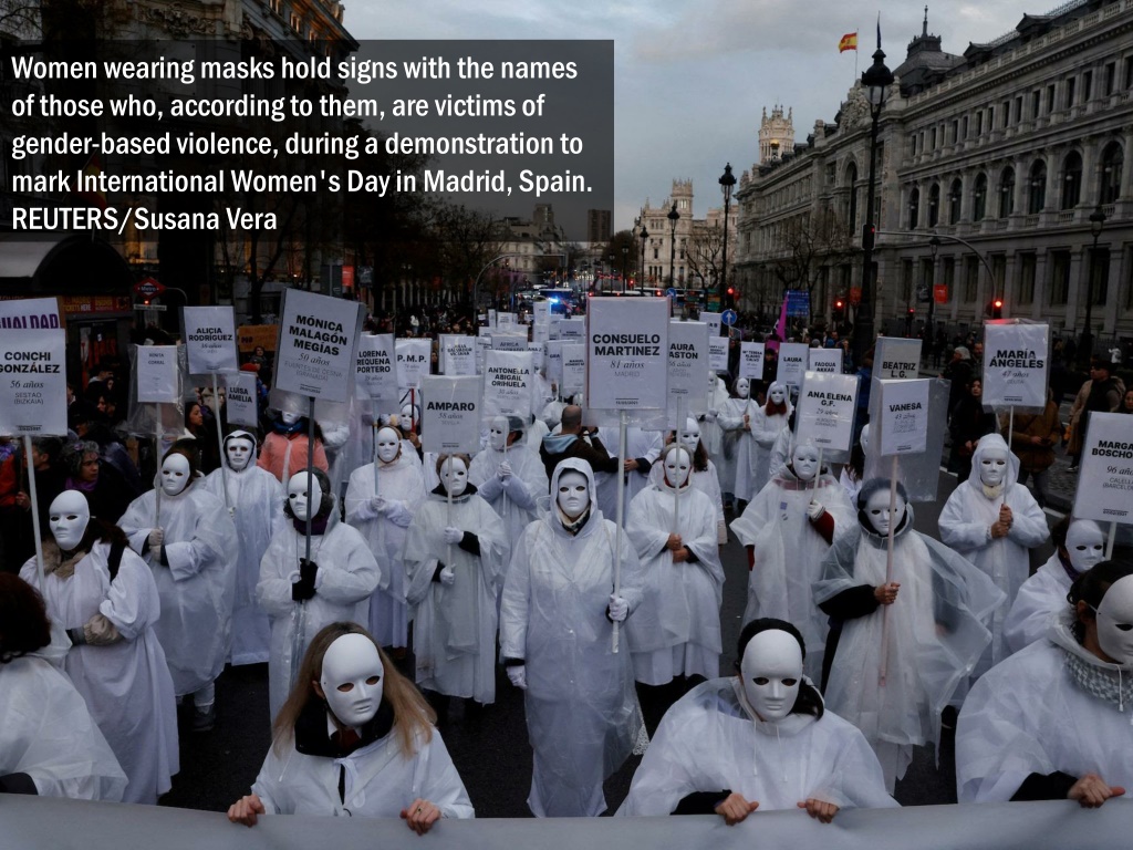 Women wearing masks hold signs with the names of those who, according to them, are victims of gender-based violence, during a demonstration to mark International Women's Day in Madrid, Spain. REUTERS/Susana Vera