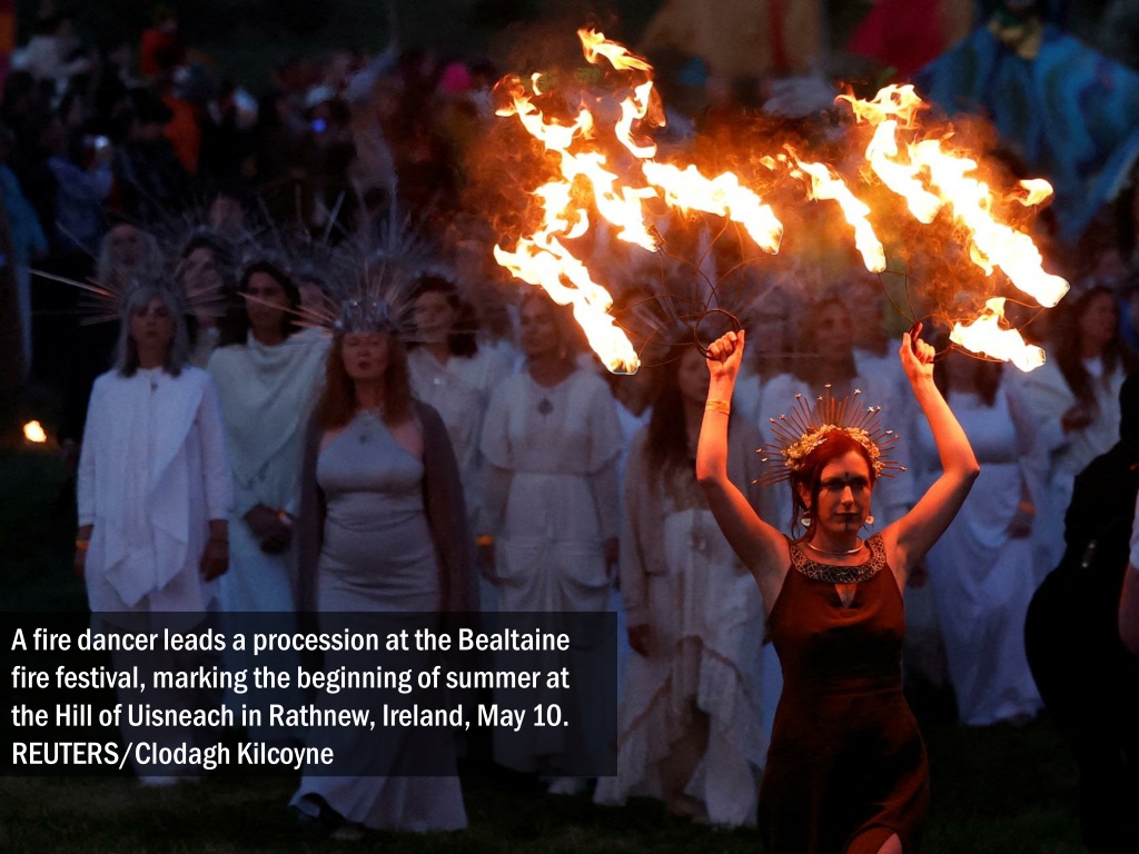 A fire dancer leads a procession at the Bealtaine fire festival, marking the beginning of summer at the Hill of Uisneach in Rathnew, Ireland, May 10. REUTERS/Clodagh Kilcoyne