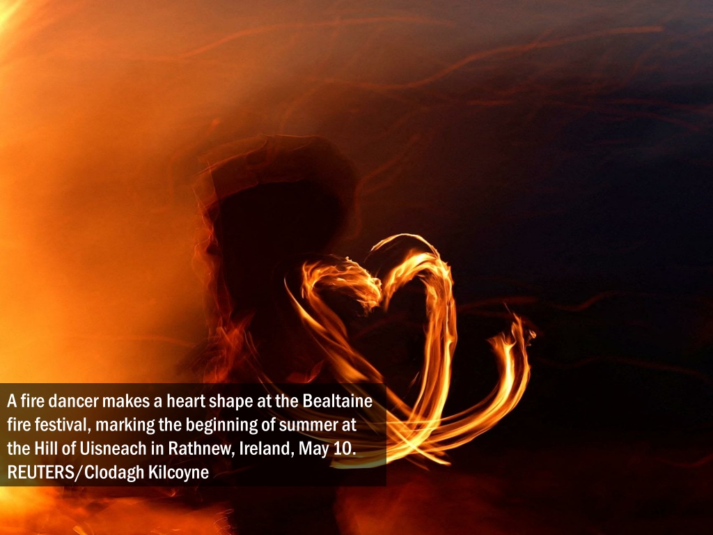 A fire dancer makes a heart shape at the Bealtaine fire festival, marking the beginning of summer at the Hill of Uisneach in Rathnew, Ireland, May 10. REUTERS/Clodagh Kilcoyne