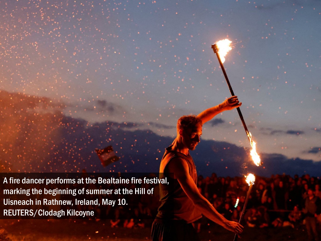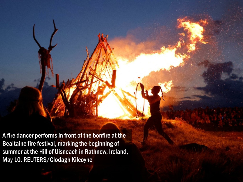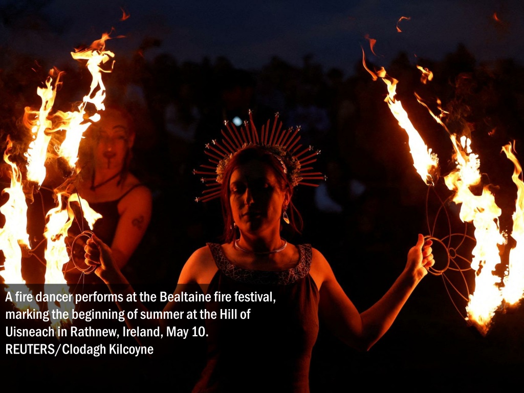 A fire dancer performs in front of the bonfire at the Bealtaine fire festival, marking the beginning of summer at the Hill of Uisneach in Rathnew, Ireland, May 10. REUTERS/Clodagh Kilcoyne