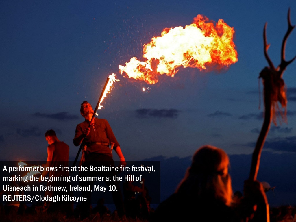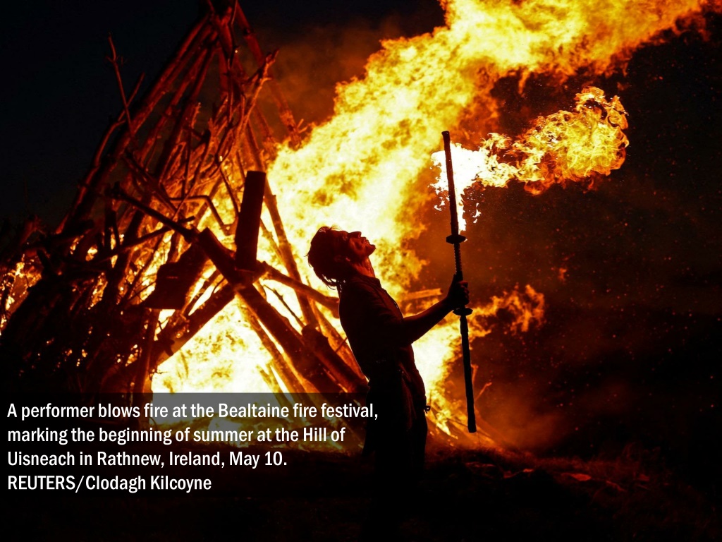 A performer blows fire at the Bealtaine fire festival, marking the beginning of summer at the Hill of Uisneach in Rathnew, Ireland, May 10. REUTERS/Clodagh Kilcoyne