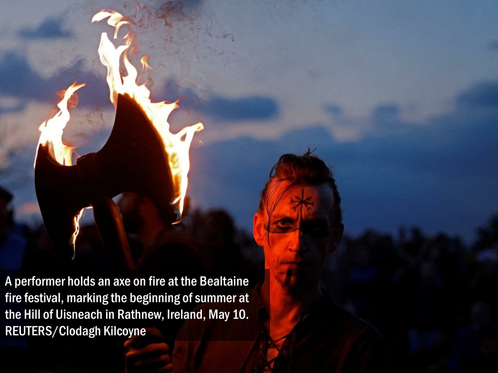A performer holds an axe on fire at the Bealtaine fire festival, marking the beginning of summer at the Hill of Uisneach in Rathnew, Ireland, May 10. REUTERS/Clodagh Kilcoyne