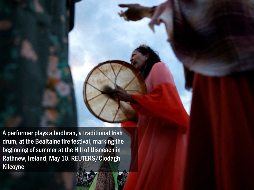 A performer plays a bodhran, a traditional Irish drum, at the Bealtaine fire festival, marking the beginning of summer at the Hill of Uisneach in Rathnew, Ireland, May 10. REUTERS/Clodagh Kilcoyne