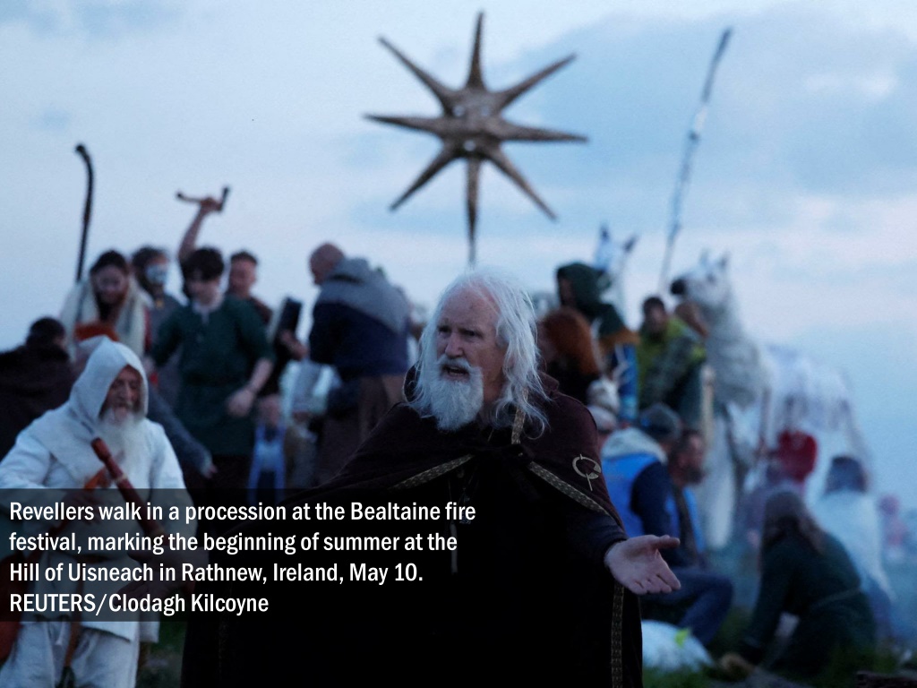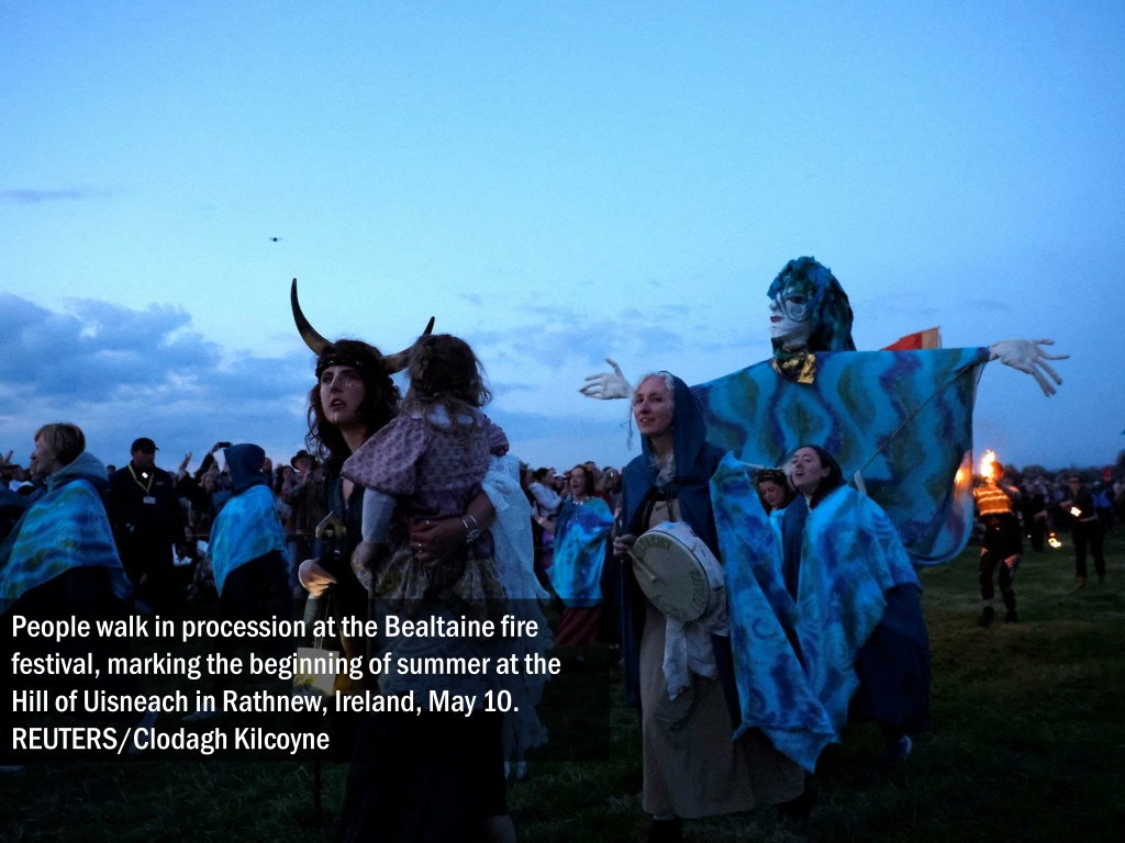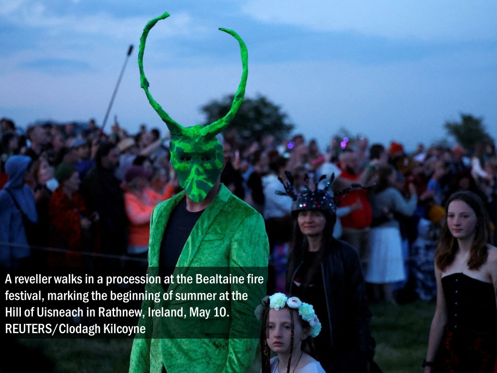 Revellers walk in a procession at the Bealtaine fire festival, marking the beginning of summer at the Hill of Uisneach in Rathnew, Ireland, May 10. REUTERS/Clodagh Kilcoyne