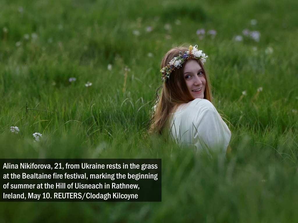 Alina Nikiforova, 21, from Ukraine rests in the grass at the Bealtaine fire festival, marking the beginning of summer at the Hill of Uisneach in Rathnew, Ireland, May 10. REUTERS/Clodagh Kilcoyne