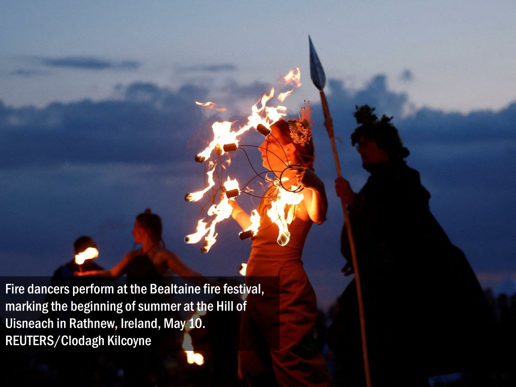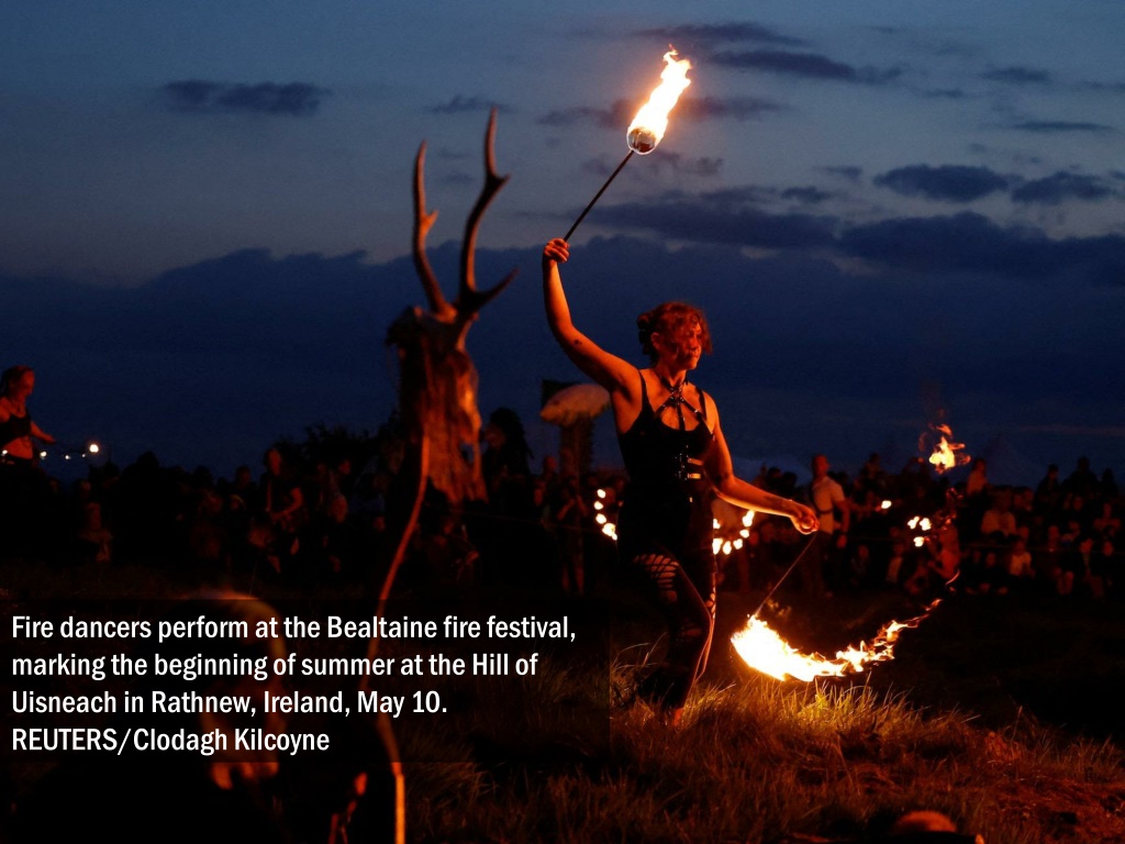 Fire dancers perform at the Bealtaine fire festival, marking the beginning of summer at the Hill of Uisneach in Rathnew, Ireland, May 10. REUTERS/Clodagh Kilcoyne