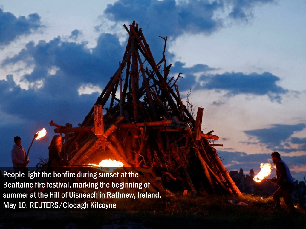 People light the bonfire during sunset at the Bealtaine fire festival, marking the beginning of summer at the Hill of Uisneach in Rathnew, Ireland, May 10. REUTERS/Clodagh Kilcoyne