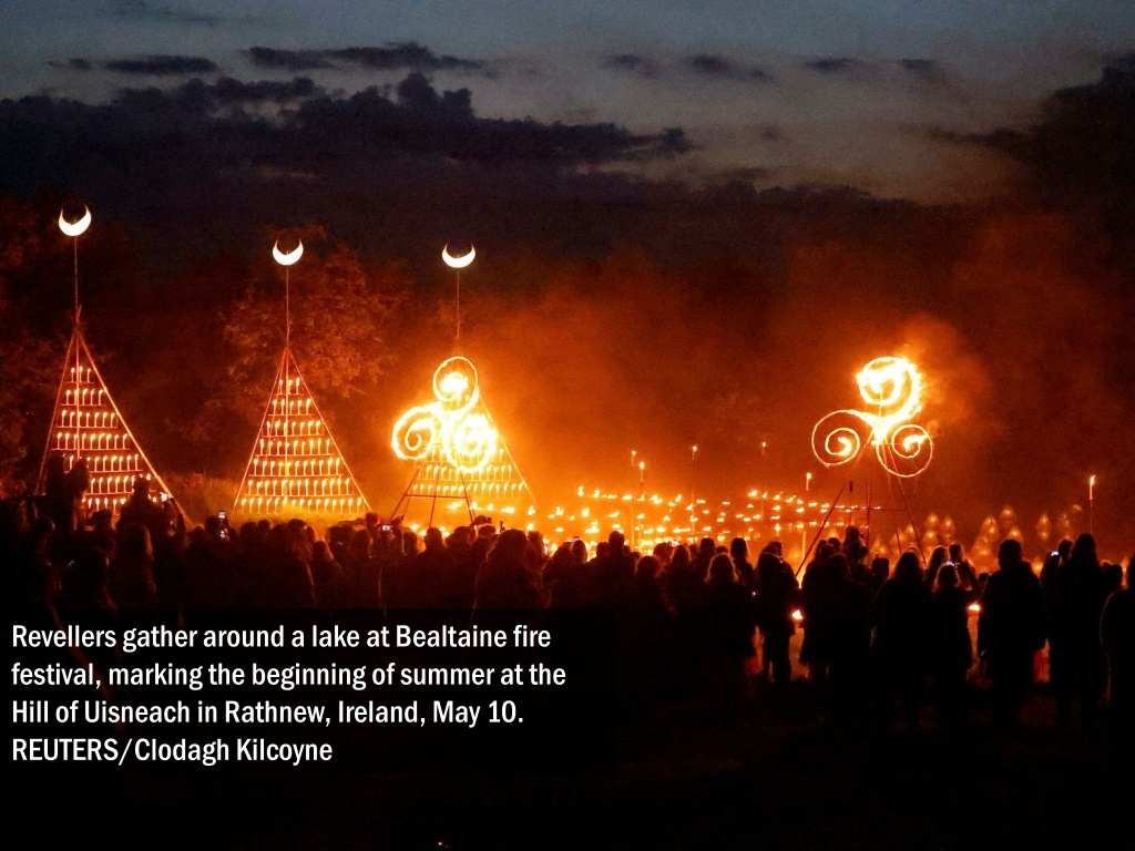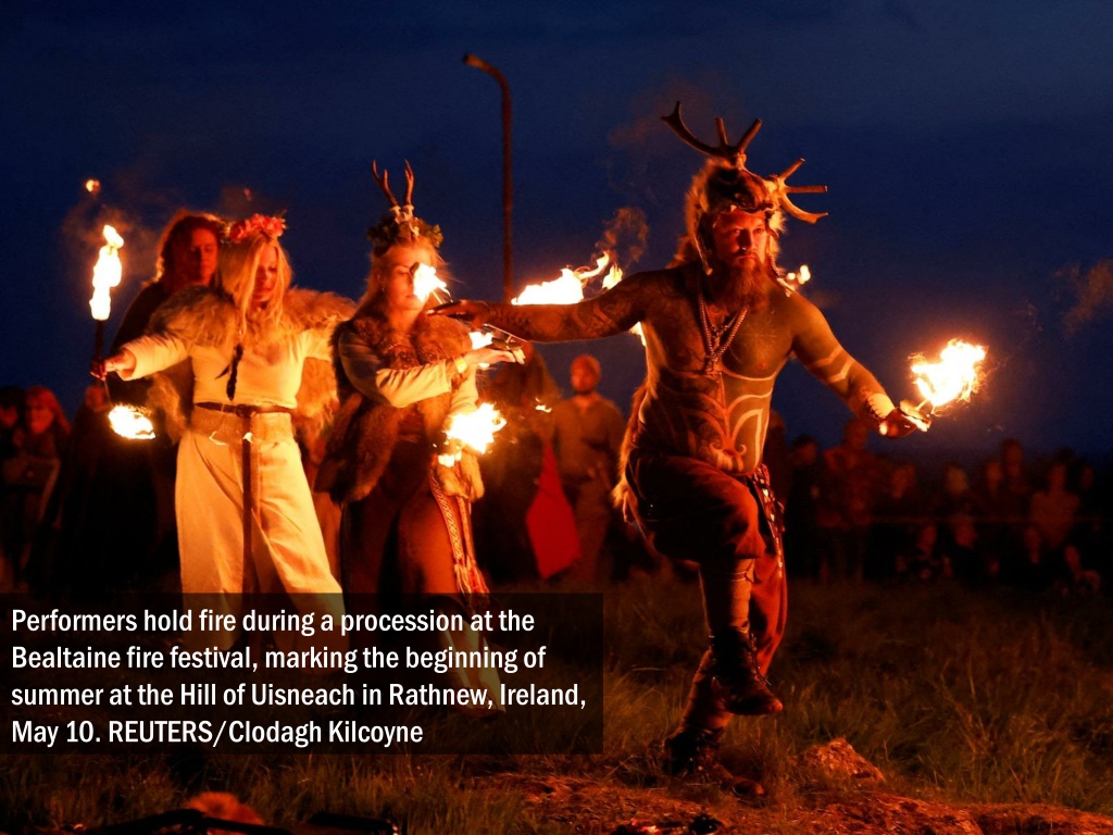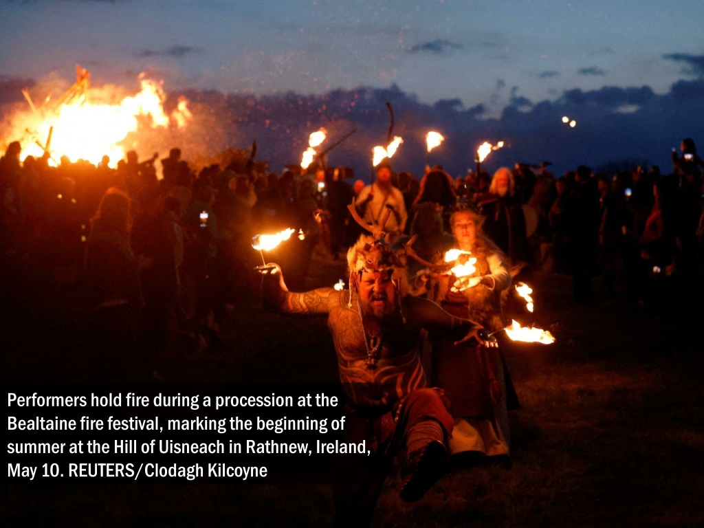 Performers hold fire during a procession at the Bealtaine fire festival, marking the beginning of summer at the Hill of Uisneach in Rathnew, Ireland, May 10. REUTERS/Clodagh Kilcoyne