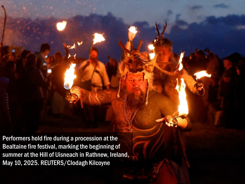 Performers hold fire during a procession at the Bealtaine fire festival, marking the beginning of summer at the Hill of Uisneach in Rathnew, Ireland, May 10, 2025. REUTERS/Clodagh Kilcoyne