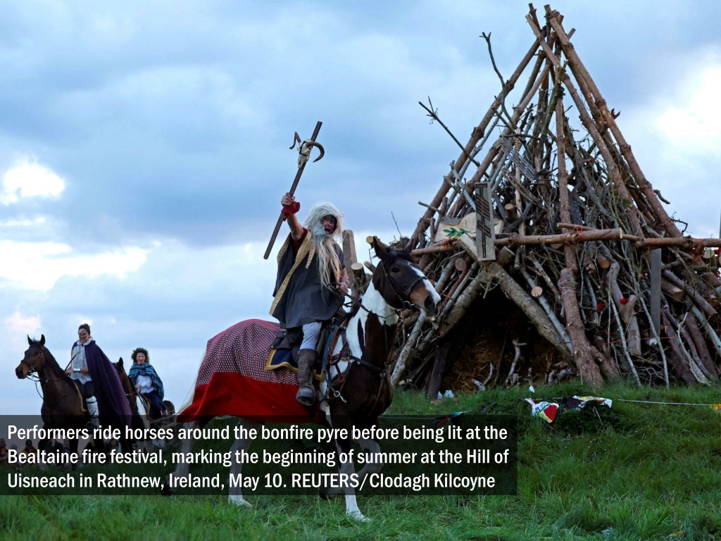 Performers ride horses around the bonfire pyre before being lit at the Bealtaine fire festival, marking the beginning of summer at the Hill of Uisneach in Rathnew, Ireland, May 10. REUTERS/Clodagh Kilcoyne