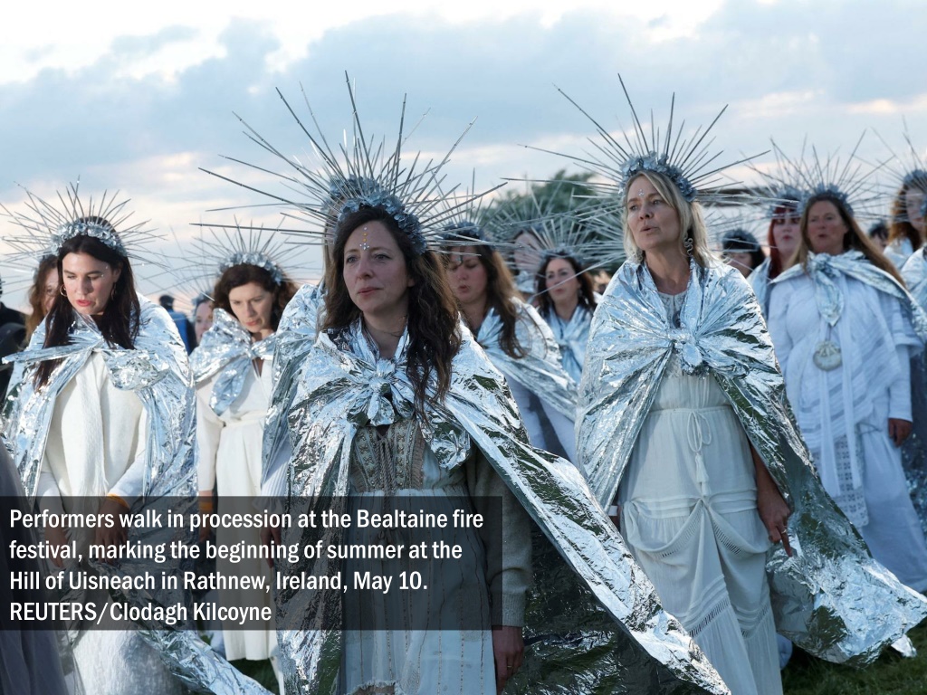 Performers walk in procession at the Bealtaine fire festival, marking the beginning of summer at the Hill of Uisneach in Rathnew, Ireland, May 10. REUTERS/Clodagh Kilcoyne