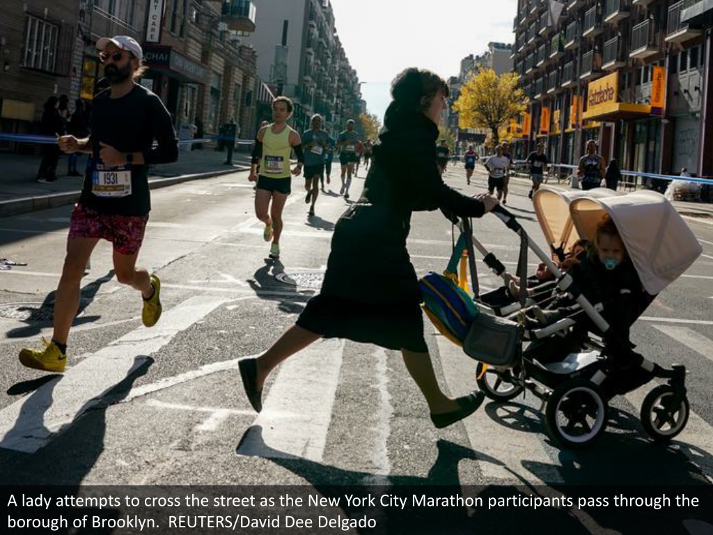 A lady attempts to cross the street as the New York City Marathon participants pass through the borough of Brooklyn. REUTERS/David Dee Delgado
