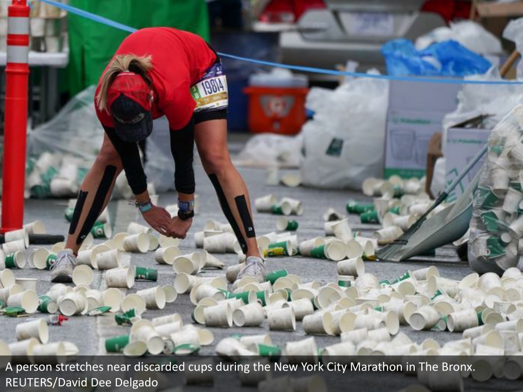 A person stretches near discarded cups during the New York City Marathon in The Bronx. REUTERS/David Dee Delgado