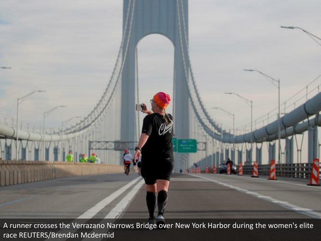 A runner crosses the Verrazano Narrows Bridge over New York Harbor during the women's elite race REUTERS/Brendan Mcdermid