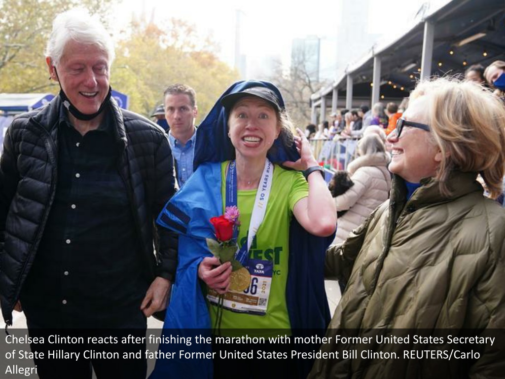 Chelsea Clinton reacts after finishing the marathon with mother Former United States Secretary of State Hillary Clinton and father Former United States President Bill Clinton. REUTERS/Carlo Allegri