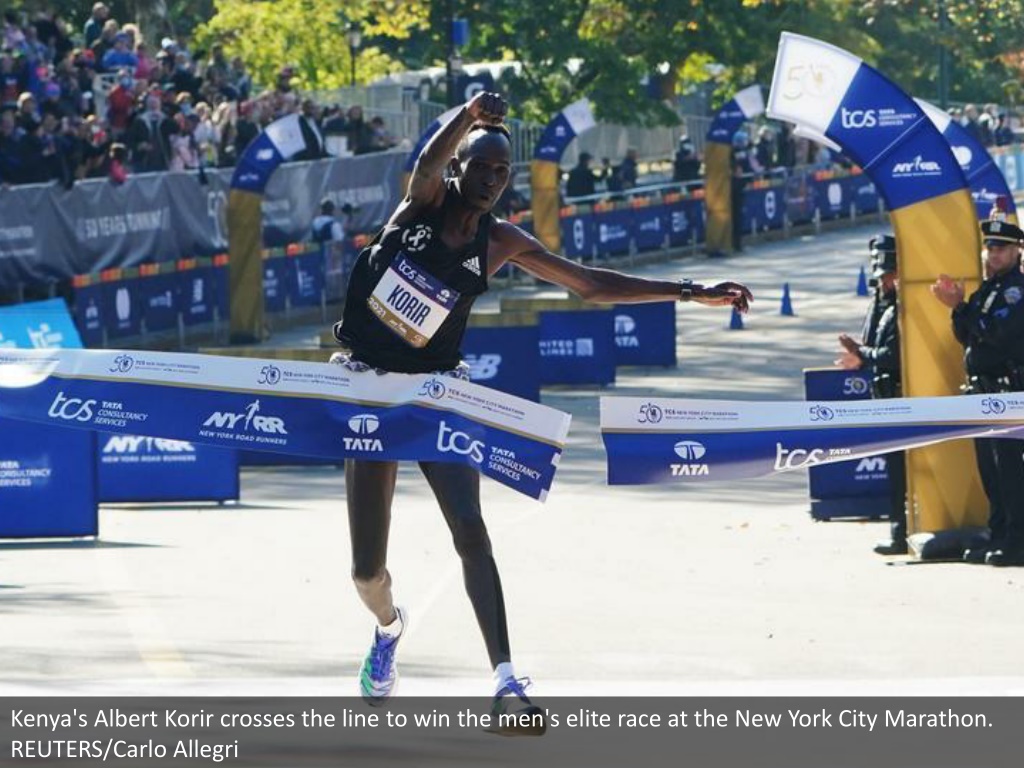 Kenya's Albert Korir crosses the line to win the men's elite race at the New York City Marathon. REUTERS/Carlo Allegri