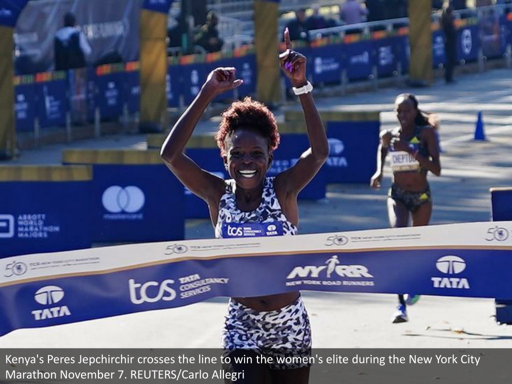 Kenya's Peres Jepchirchir crosses the line to win the women's elite during the New York City Marathon November 7. REUTERS/Carlo Allegri