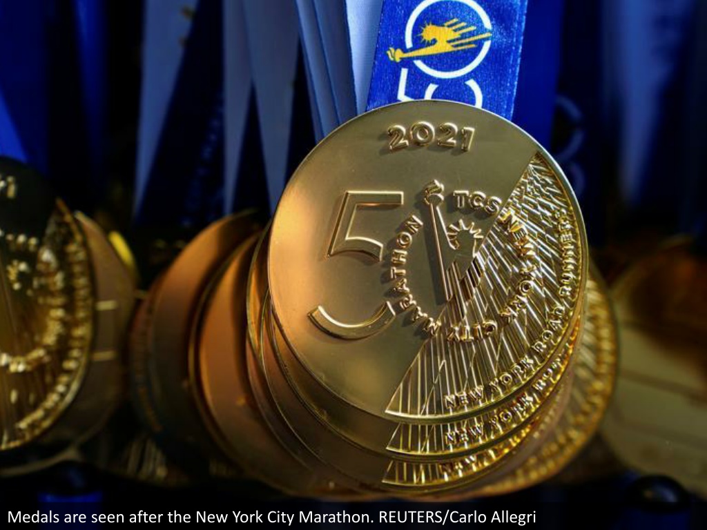 Medals are seen after the New York City Marathon. REUTERS/Carlo Allegri