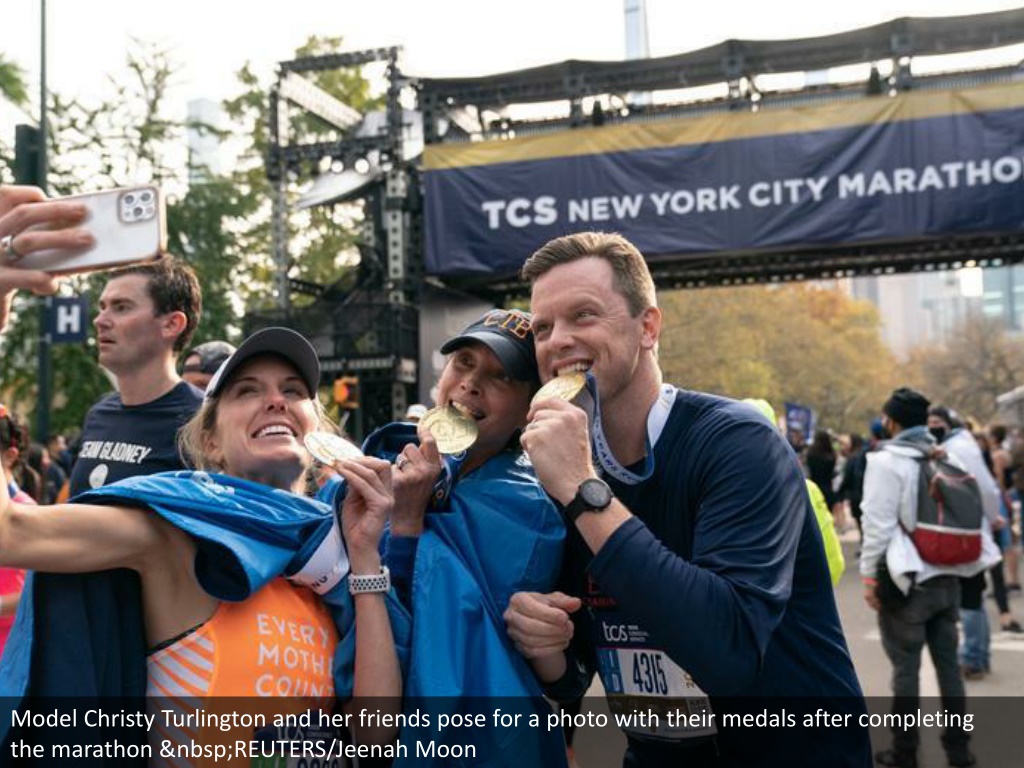 Model Christy Turlington and her friends pose for a photo with their medals after completing the marathon REUTERS/Jeenah Moon