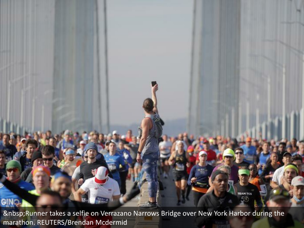 Runner takes a selfie on Verrazano Narrows Bridge over New York Harbor during the marathon. REUTERS/Brendan Mcdermid