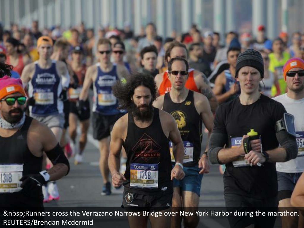 Runners cross the Verrazano Narrows Bridge over New York Harbor during the marathon. REUTERS/Brendan Mcdermid