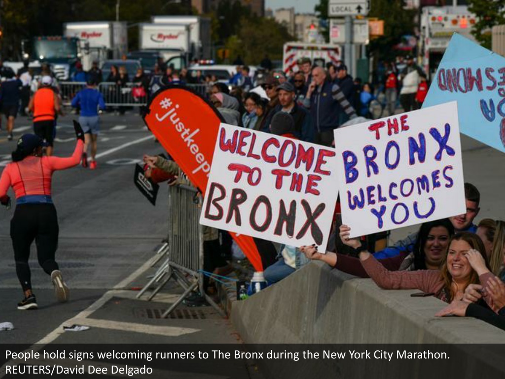 People hold signs welcoming runners to The Bronx during the New York City Marathon. REUTERS/David Dee Delgado
