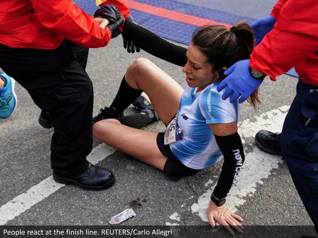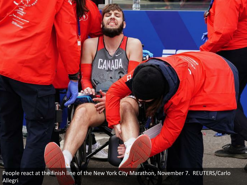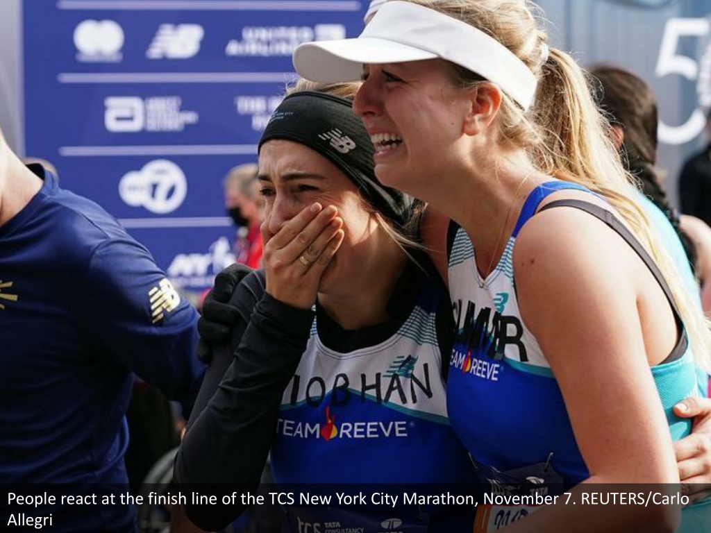 People react at the finish line of the TCS New York City Marathon, November 7. REUTERS/Carlo Allegri