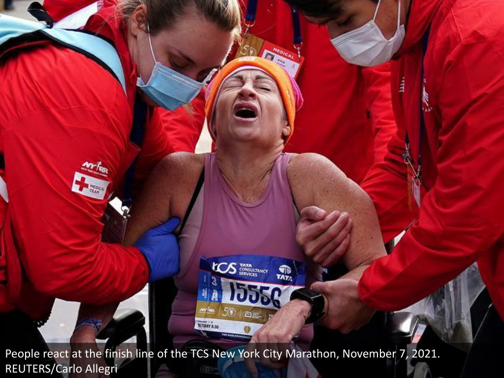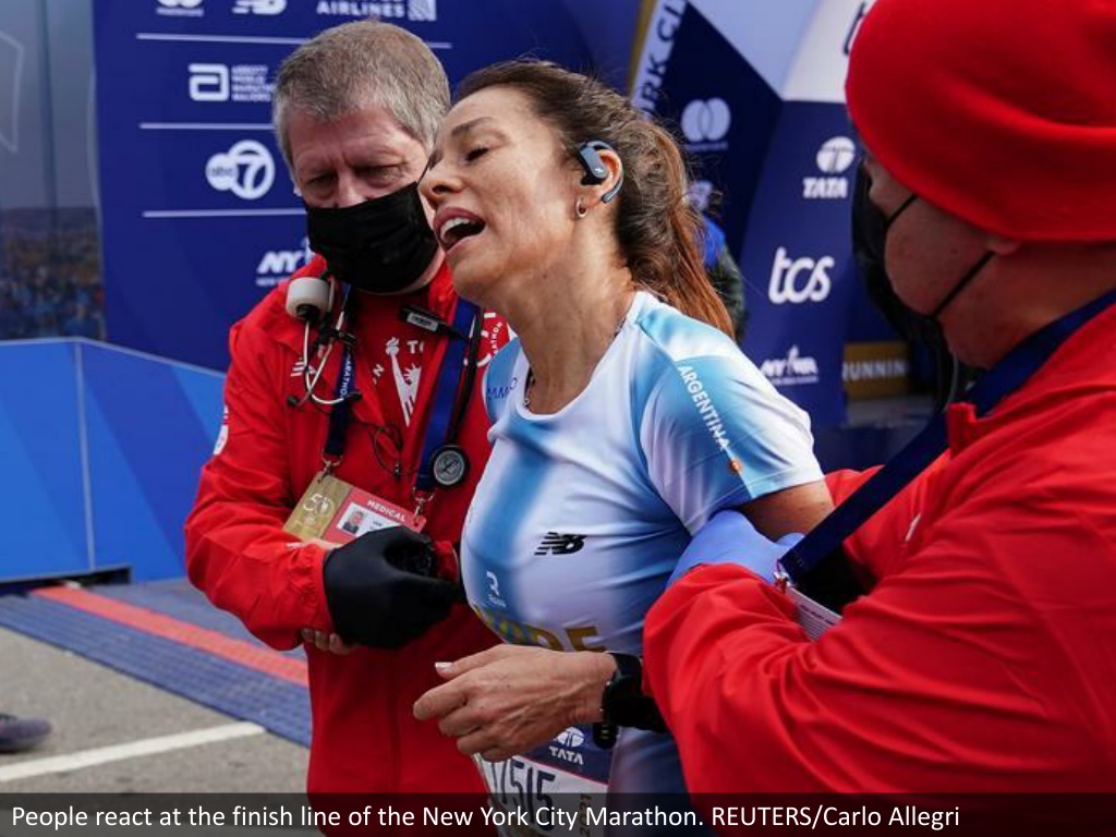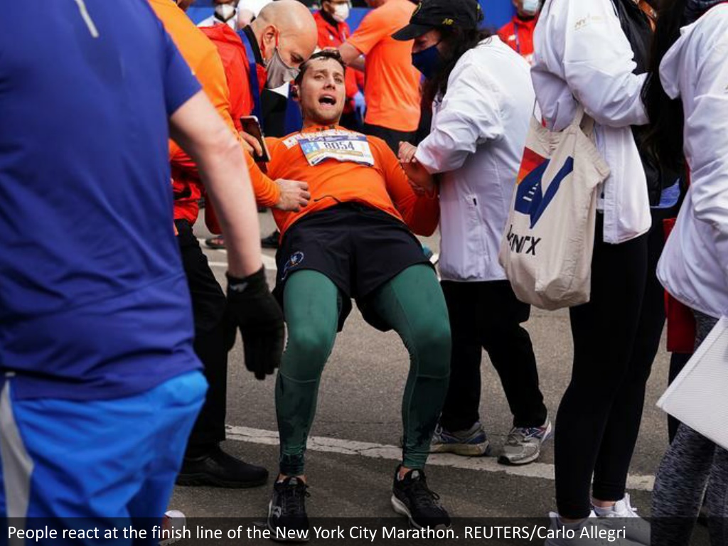 People react at the finish line of the TCS New York City Marathon, November 7, 2021. REUTERS/Carlo Allegri