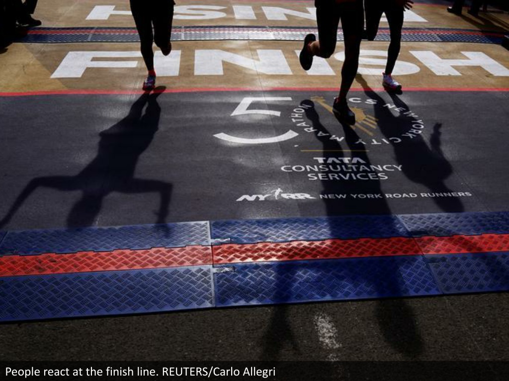 People react at the finish line of the New York City Marathon, November 7. REUTERS/Carlo Allegri